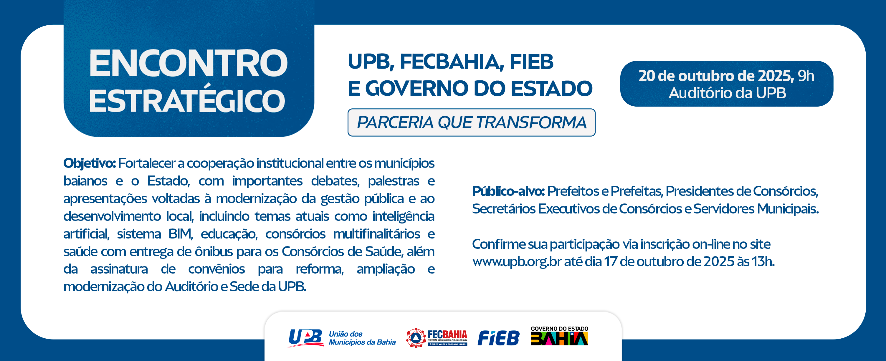 Apresentar o programa “Nova UPB: Governança de Verdade” e ações estratégicas da FECBAHIA, FIEB e Governo do Estado, constituindo um espaço de diálogo, integração e cooperação institucional, visando o fortalecimento dos municípios baianos.